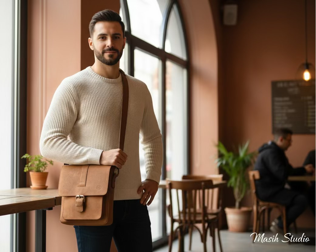 The Arman Crest by Masih Studio is a classic leather shoulder bag designed with a structured silhouette and a refined vintage character.