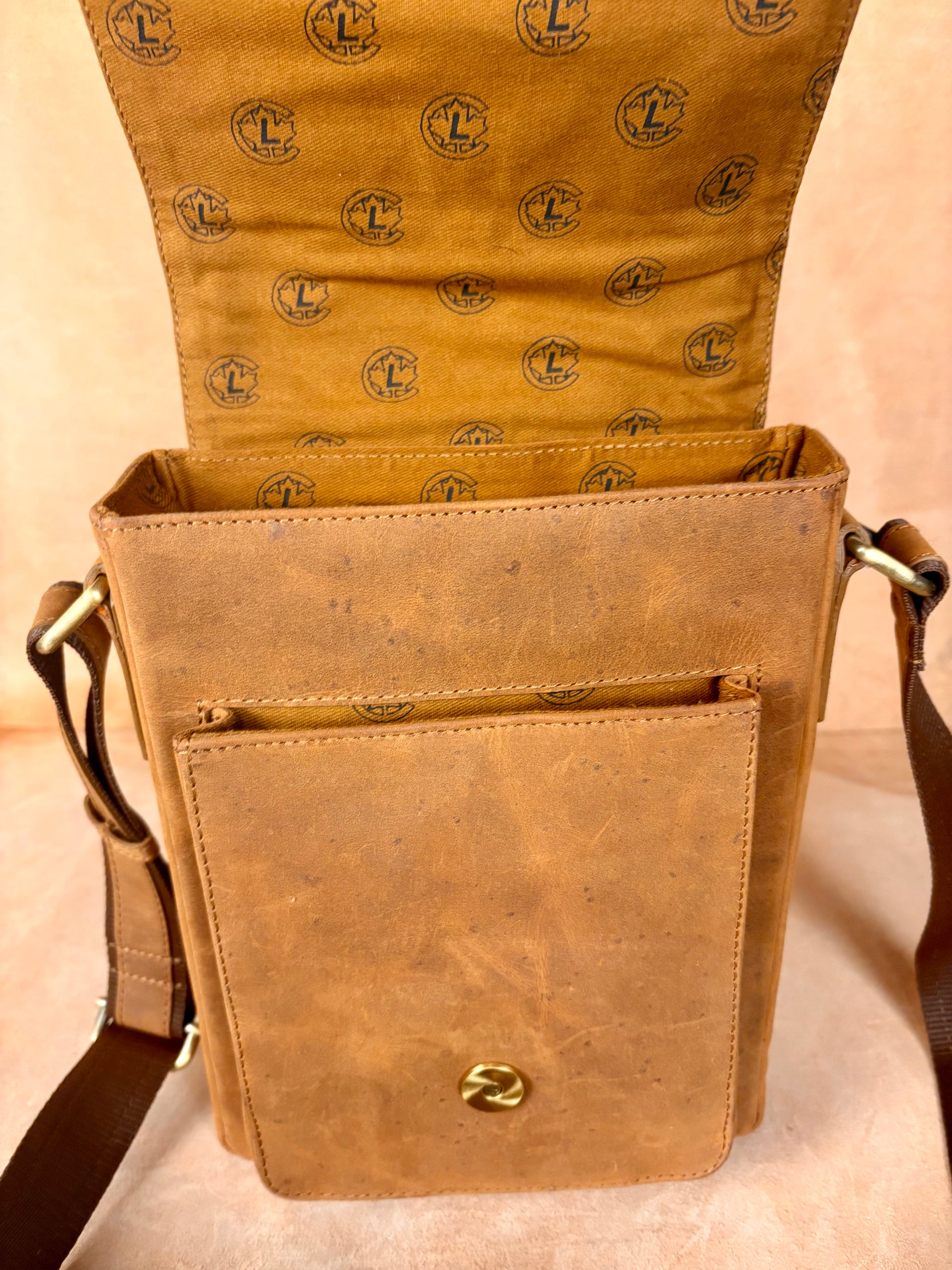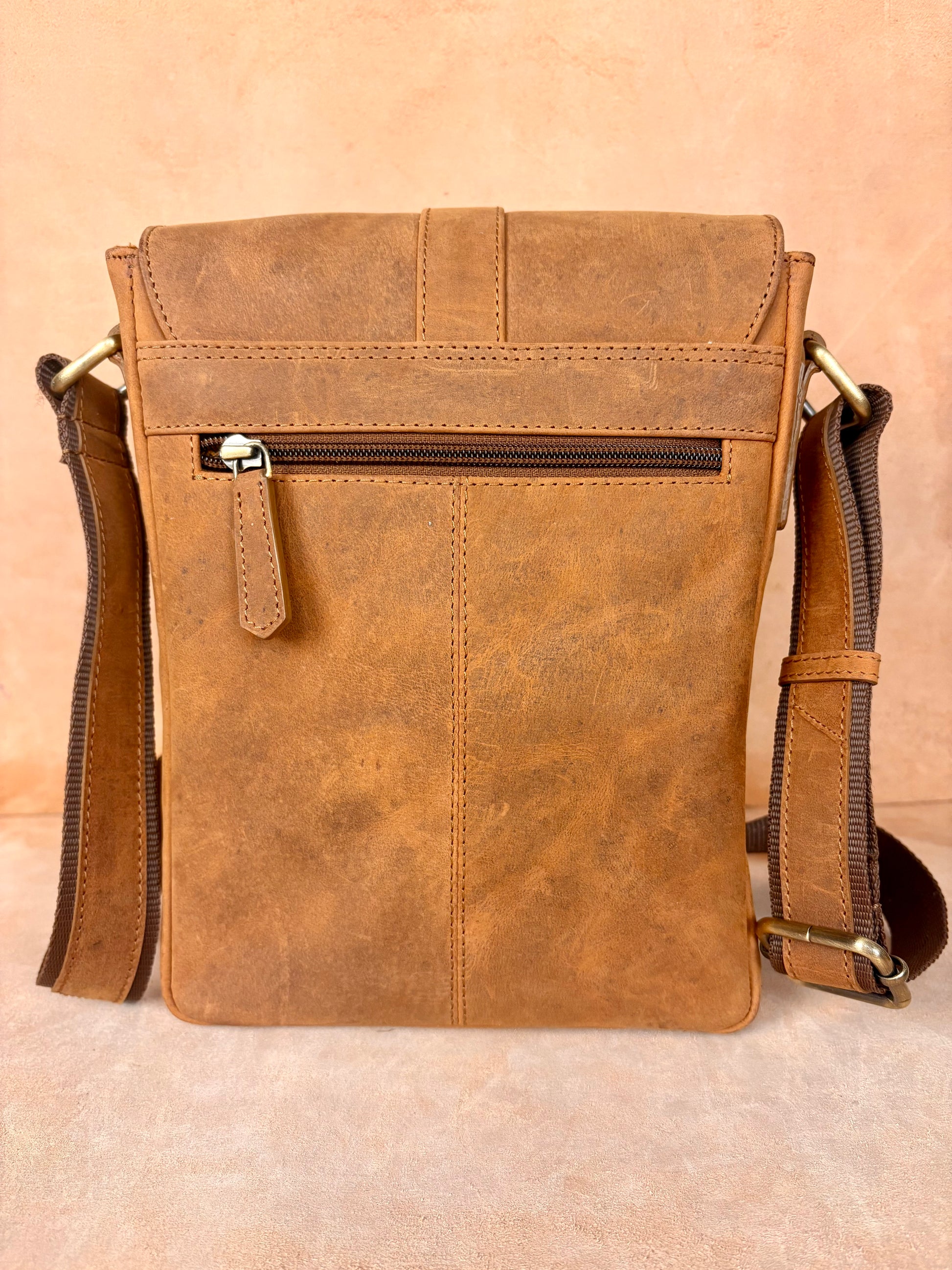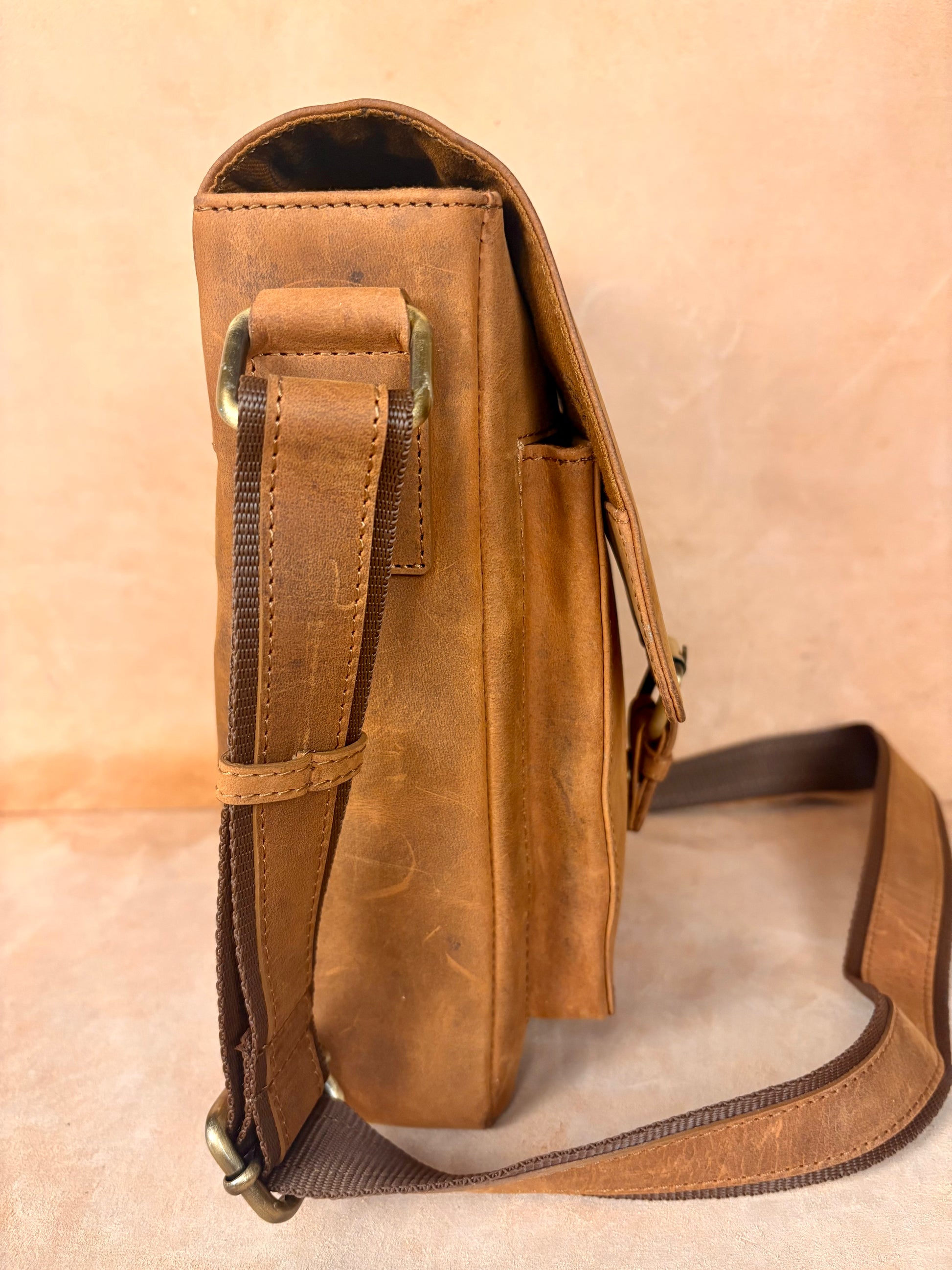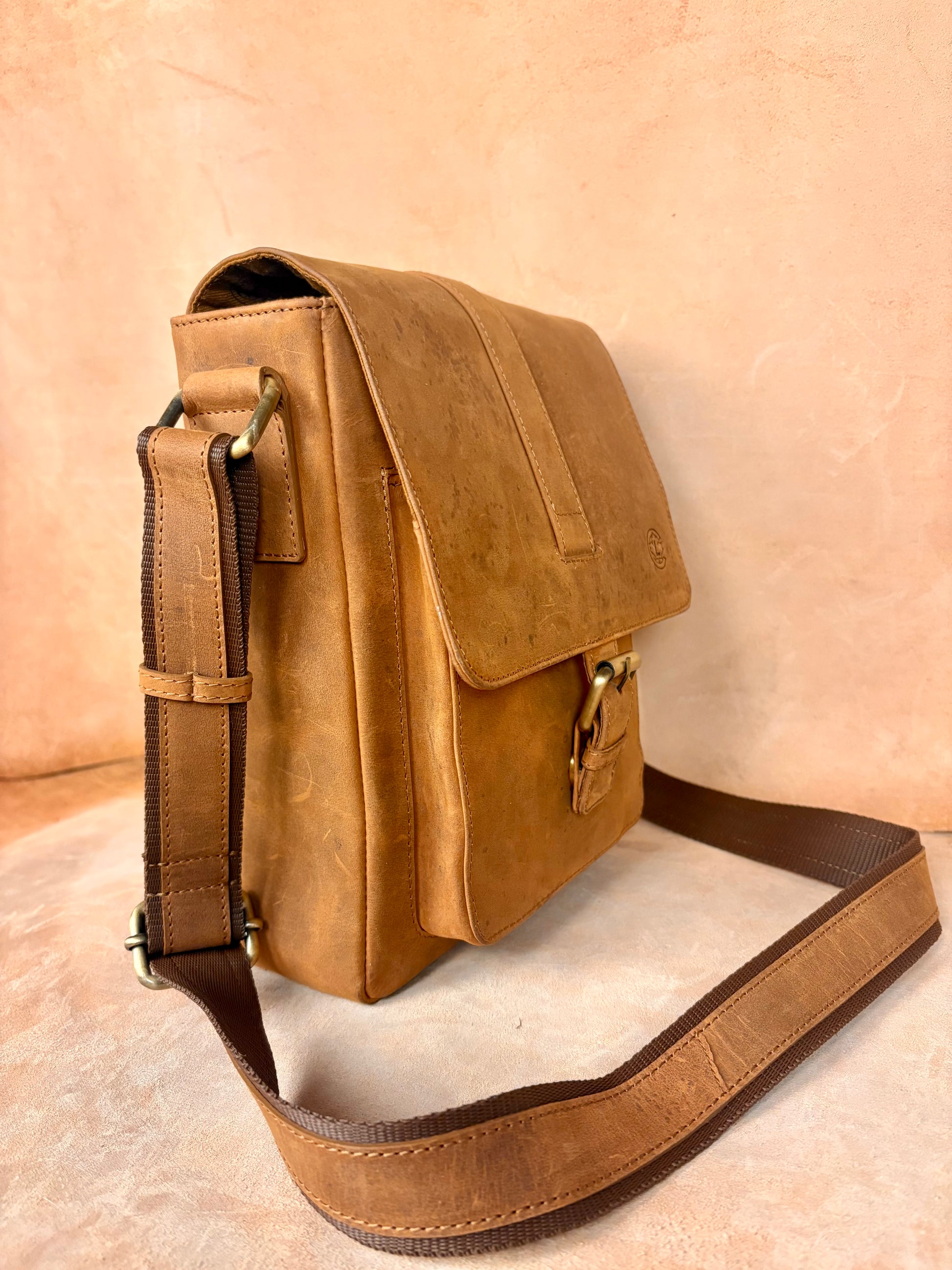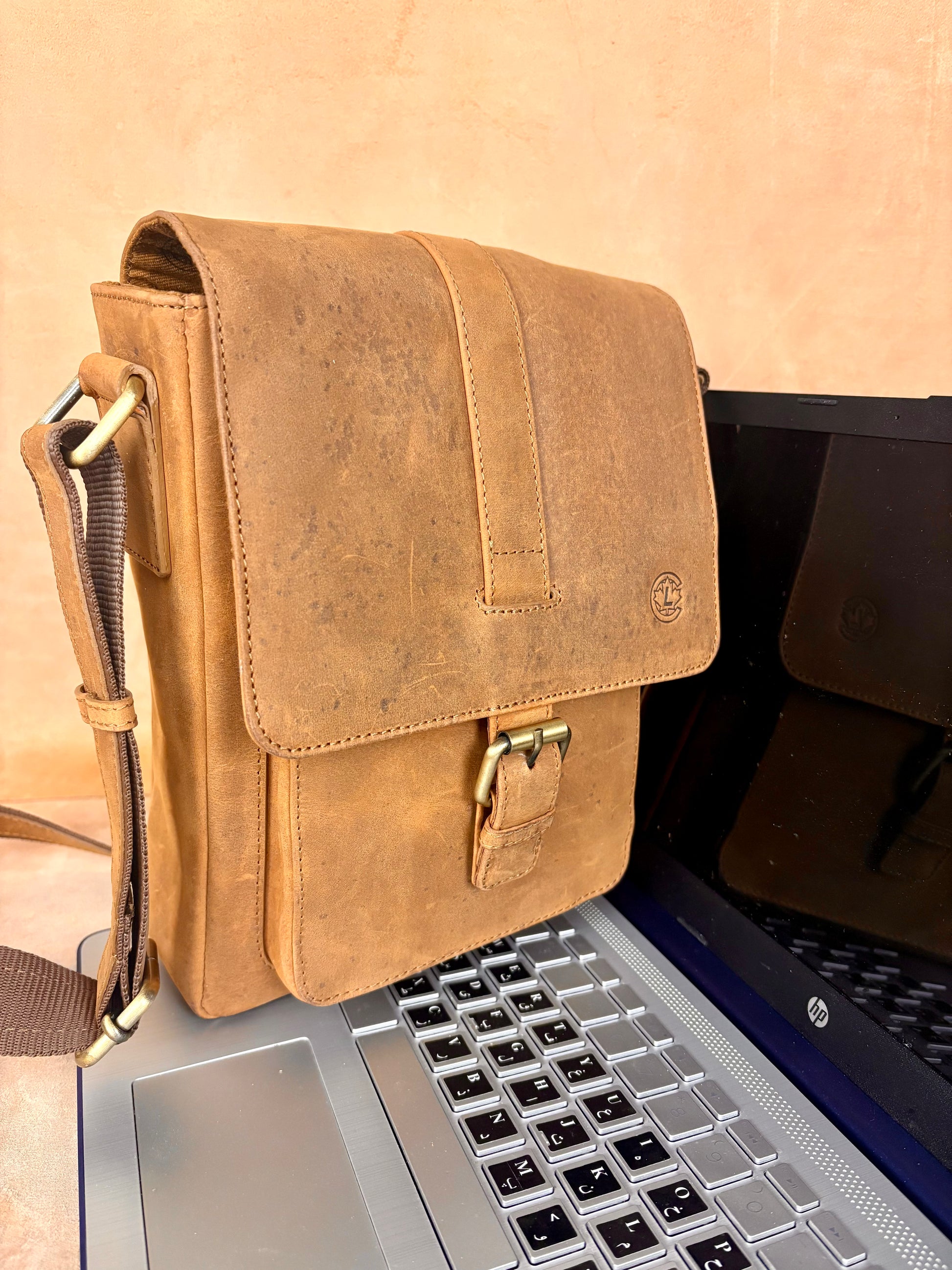 Crafted from premium buffalo leather, it features a secure buckle closure that enhances both style and durability. Its balanced size makes it ideal for carrying daily essentials such as your phone, wallet, small notebook, and accessories.