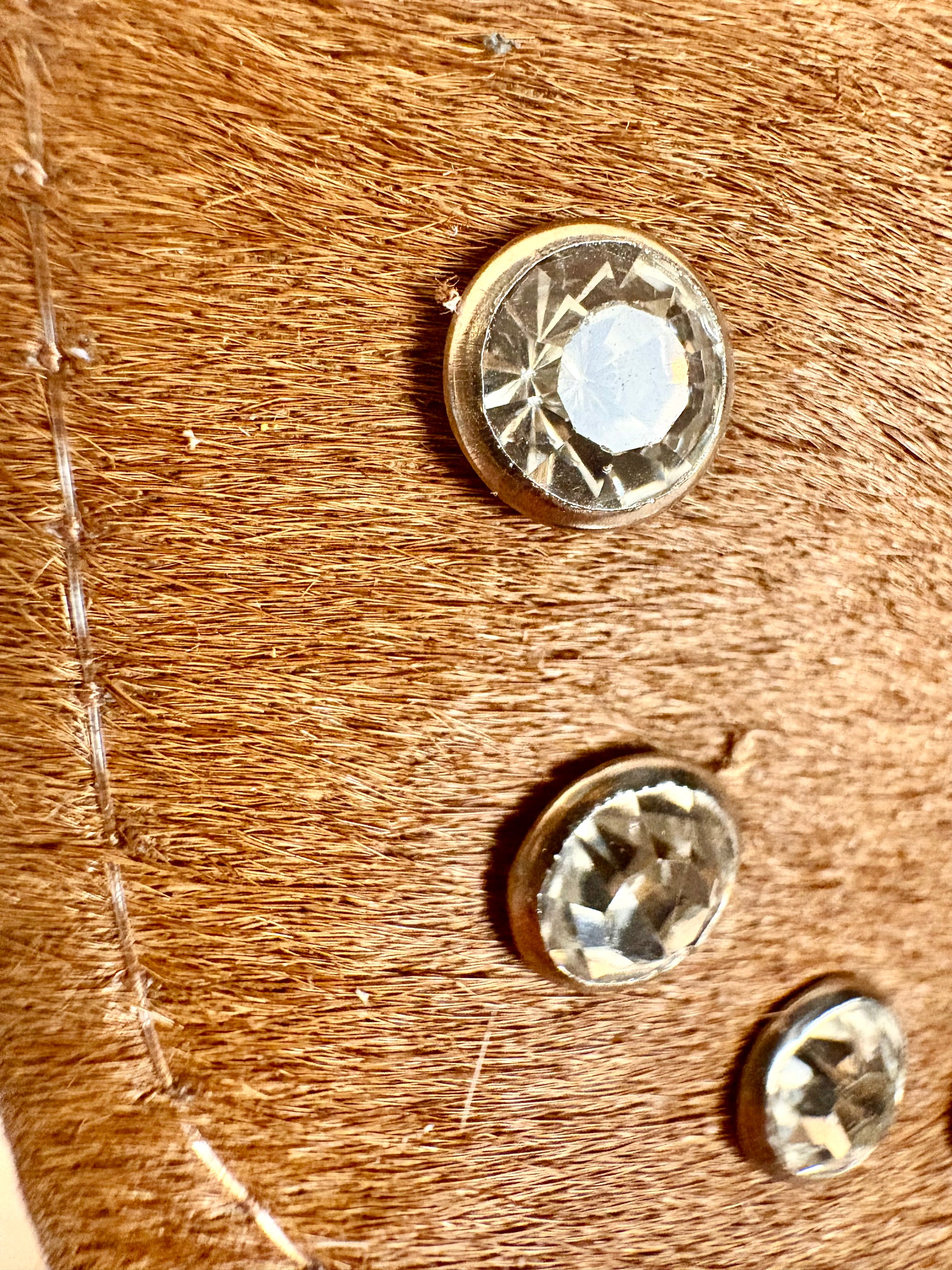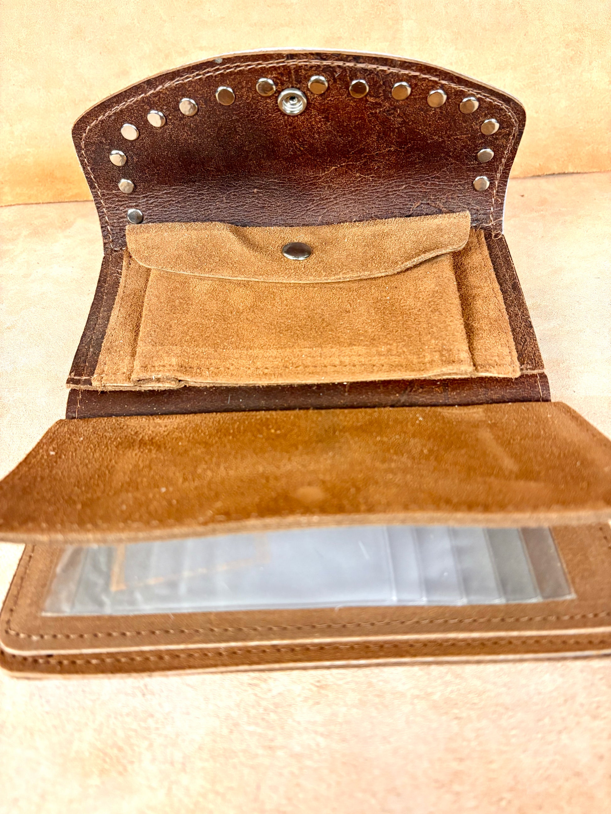 The Sienna Leather Wallet combines soft textured leather with decorative stud detailing for a bold yet elegant look. Its curved flap design and subtle shine accents create a distinctive statement piece.
